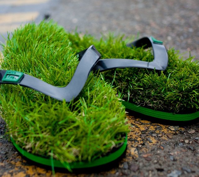 なかなか珍しい人工芝で出来たビーチサンダル。「裸足で芝生を踏む感覚が常に味わえる」というコンセプトだそうですが、感覚的にも見た目的にも気持ち良さそうなサンダルですね。結構、芝、ふっさふさ。
