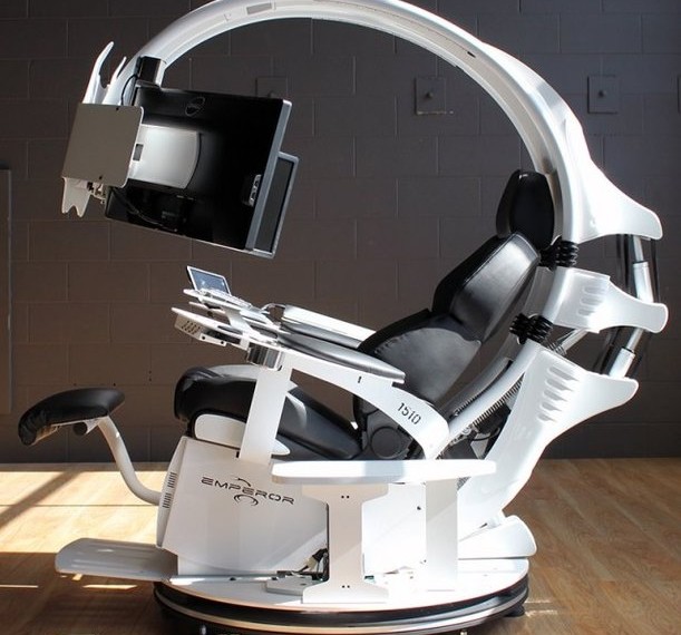 完全にブっとんだプロダクト。一瞬見た感じ、「なんなのコレ?」と。こういうモノの名称がいまいち分からないんですが、パソコン作業する為のワークステーションとでも言えばいいんでしょうか。まるでSF映画やアニメに出てくるような「コックピット」。もしくは、最新式の歯医者の治療台?